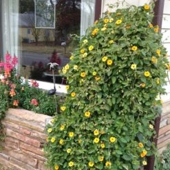This gorgeous vine grows to be about 6 to 8 feet tall in a season and has rough, textured foliage. The symmetrical flowers have deep centers and create a quick, dramatic statement in the summer garden.