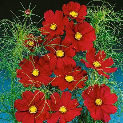 “Dazzler” stands alone among the new cosmos hybrids, with unique, almost rectangular blunt-tipped petals. The coloring is different too. This is one of the few true red cosmos–not pink, not purple, not maroon, but real red. At 3 to 5 ft, like all the others, it’s a snap to grow from seed, so you’ll have big bloom from midsummer right up until frost.