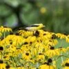 Helenium autumnale is a joyful golden addition to native and pollinator-friendly gardens. Great for rain gardens or low-lying garden sites, plant in a sunny spot somewhat protected from high winds in moist to average soil. In late summer, Helenium autumnale blooms with golden daisy-like flowers with prominent centers, which are composed of tiny disc flowers. Helenium autumnale has a broad native range across the US and most of Canada, and is recognized by The Xerces Society for its value to native bees. Deadheading will encourage new flowers. Pairs beautifully with other native perennials such as Joe Pye Weed, Iron Weed, or Blazing Star. Helenium is pollenated by insects, not by wind; it is commonly called sneezeweed, though not from the effects of its pollen – historically, its dried leaves were used to make a form of snuff.
