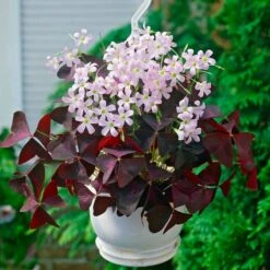 Purple Shamrock, also known as False Shamrock or Love Plant, is a particularly interesting and beautiful member of the worldwide Oxalis family, which includes wood sorrels and clover-leaved plants of all sizes and descriptions. Purple Shamrock has lovely variegated leaves that range from deep green to purple, creating unique and dramatic contrast in borders or containers. Delicate, light pink flowers appear in early summer and bloom until frost.