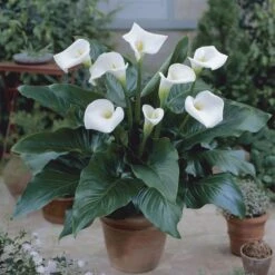 The common white one* is Zantedeschia aethiopica, and like all callas, it’s hardy in the US only in Zones 8 through 10. This makes callas ‘tender bulbs’ in most of the country, and they’ll have to be lifted out of the ground and stored indoors come fall. Zantedeschia aethiopica prefers moist soil and can even thrive when sited along stream banks and water features. Many people grow callas in patio pots, which can be brought in before frost arrives.